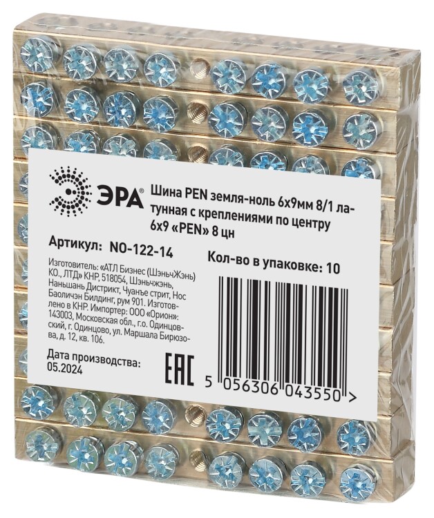 Шина ЭРА NO-122-14 PEN земля-ноль 6х9мм 8/1 латунная с креплениями по центру