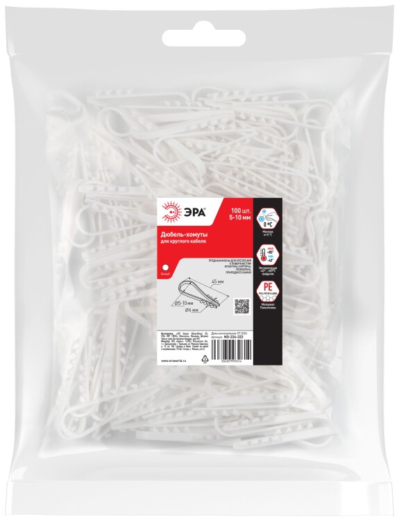 Дюбель хомут ЭРА NO-224-222 для круглого кабеля 5-10 мм белый (100 штук)