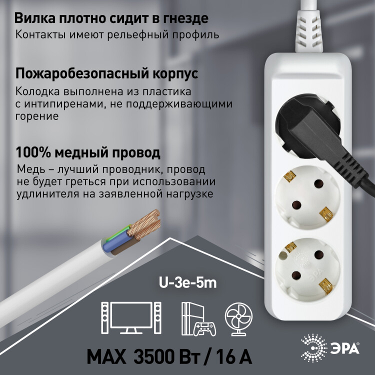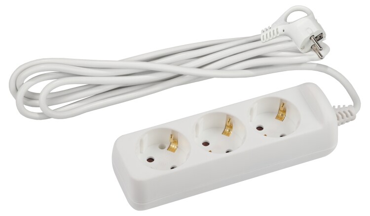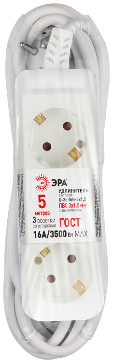 Удлинитель,3розетки, длина 5 м, 16А, ПВС 3х1,5мм², с/з, IP20, полипропилен, белый, U-3e-5m