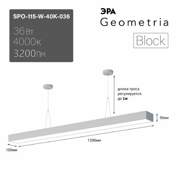 Светильник LED ЭРА Geometria SPO-115-W-40K-036 Block 36Вт 4000K 3100Лм IP40 1200*100*50 белый подвесной драйвер внутри