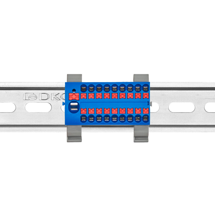 Блок распределительный с гориз. адаптером на рейку шириной 35мм, зажим push-in, 1 ввод 6 кв.мм, 18 точек подключения 2,5 кв.мм, синий
