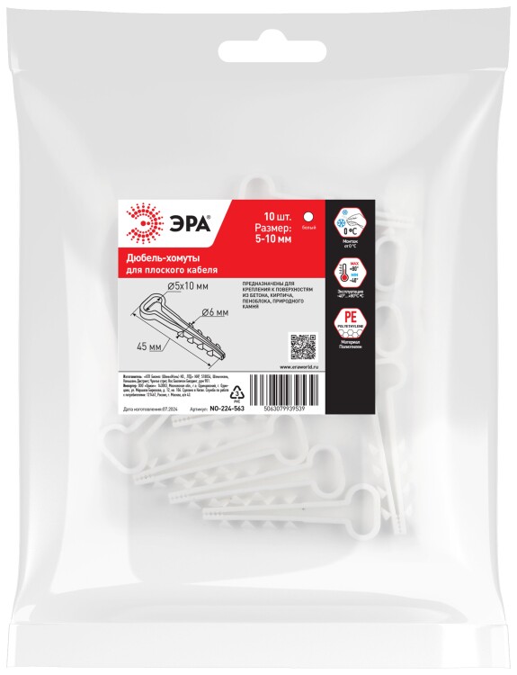 Дюбель хомут ЭРА NO-224-563 для плоского кабеля 5-10 мм белый (10 штук)