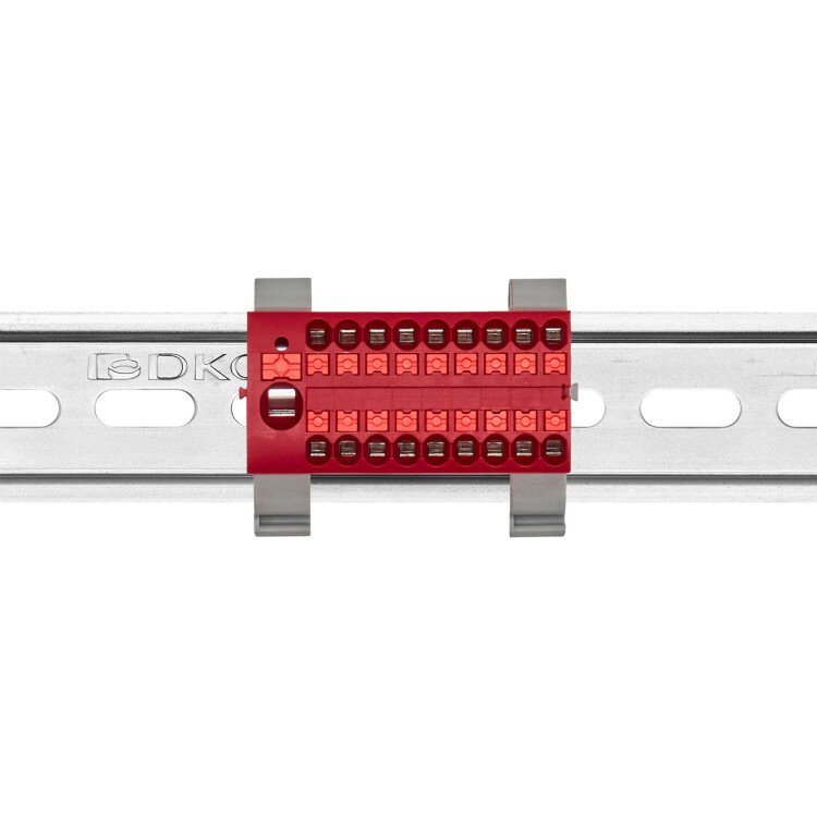 Блок распределительный с гориз. адаптером на рейку шириной 35мм, зажим push-in, 1 ввод 6 кв.мм, 18 точек подключения 2,5 кв.мм, красный