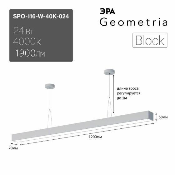 Светильник LED Geometria ЭРА Block SPO-116-W-40K-024 24Вт 4000K 1750Лм IP40 1200х70х50 белый подвесной драйвер внутри