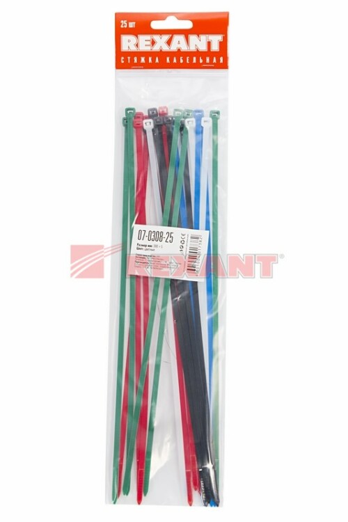 Стяжка кабельная нейлоновая 300x4,8мм, набор 5 цветов (25 шт/уп) REXANT