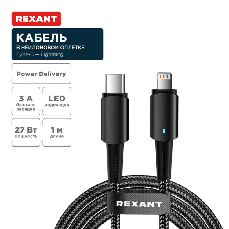 Кабель Type-C - Lightning для Apple, 3А, 1м, в черной нейлоновой оплетке, со световой индикацией REXANT