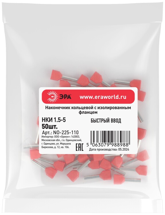 Наконечник-гильза ЭРА NO-225-100 (двойной) НШвИ(2) 1,0-10 с изолированным фланцем (упаковка 50 шт.)