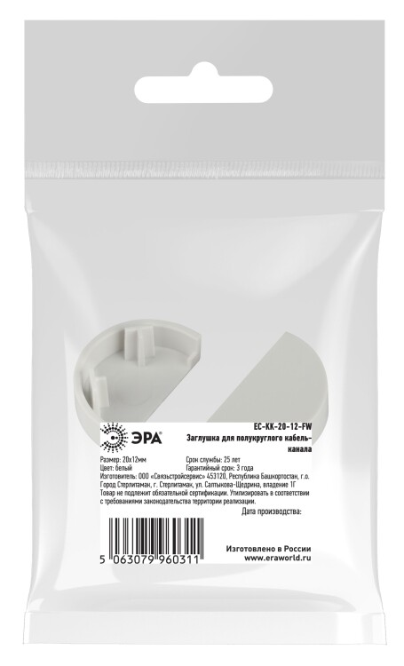 Заглушка ЭРА EC-KK-20-12-FW для полукруглого кабель-канала белая 20х12мм 2шт/комплект