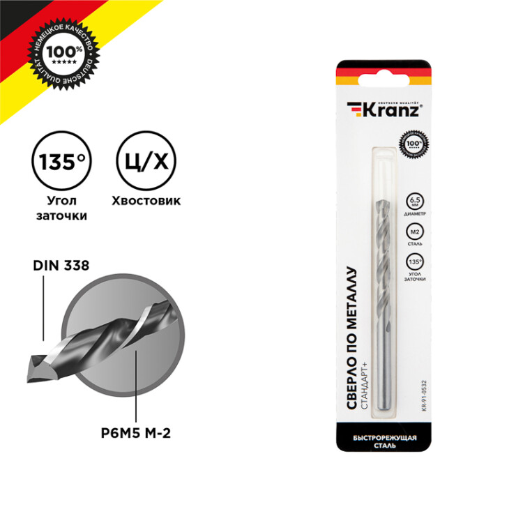 Сверло по металлу, 6,5х63х101 мм, (1 шт. в уп.), Р6М5, Стандарт+