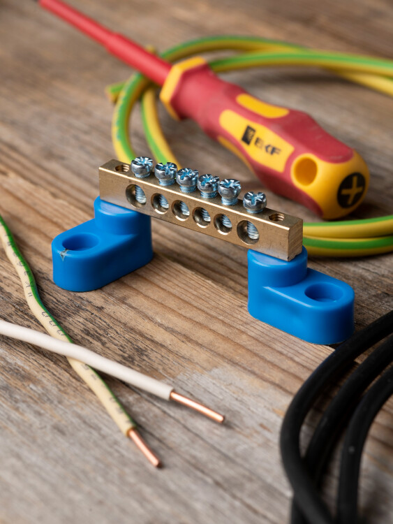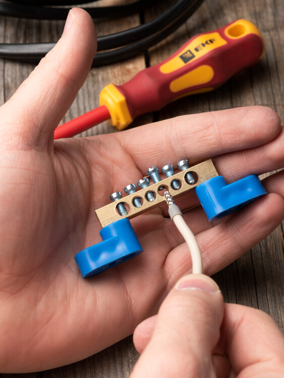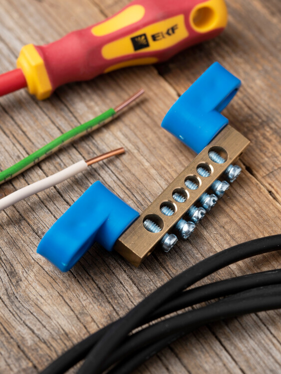 Шина "0" N (6х9мм) 6 отверстий латунь 2 синих угловых изолятора EKF PROxima