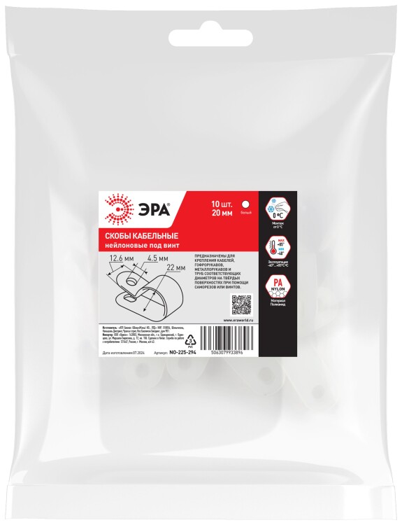 Скоба кабельная нейлоновая под винт ЭРА NO-225-294 20 мм белая 10 шт