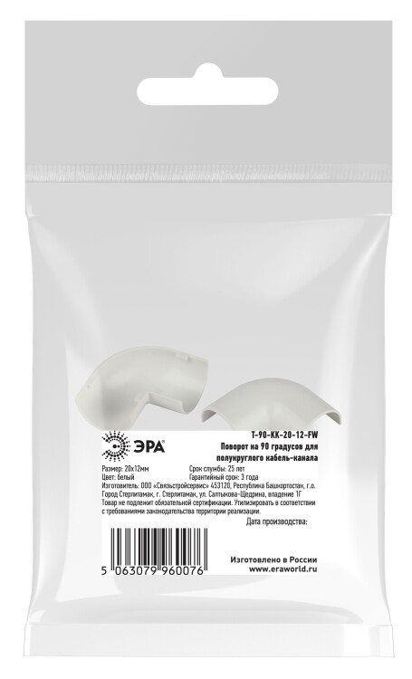 Поворот ЭРА T-90-KK-20-12-FW на 90 градусов для полукруглого кабель-канала белый 20х12мм 2шт/комплект