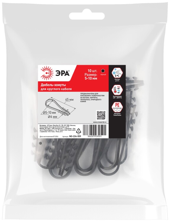 Дюбель хомут ЭРА NO-224-559 для круглого кабеля 5-10 мм чёрный (10 штук)