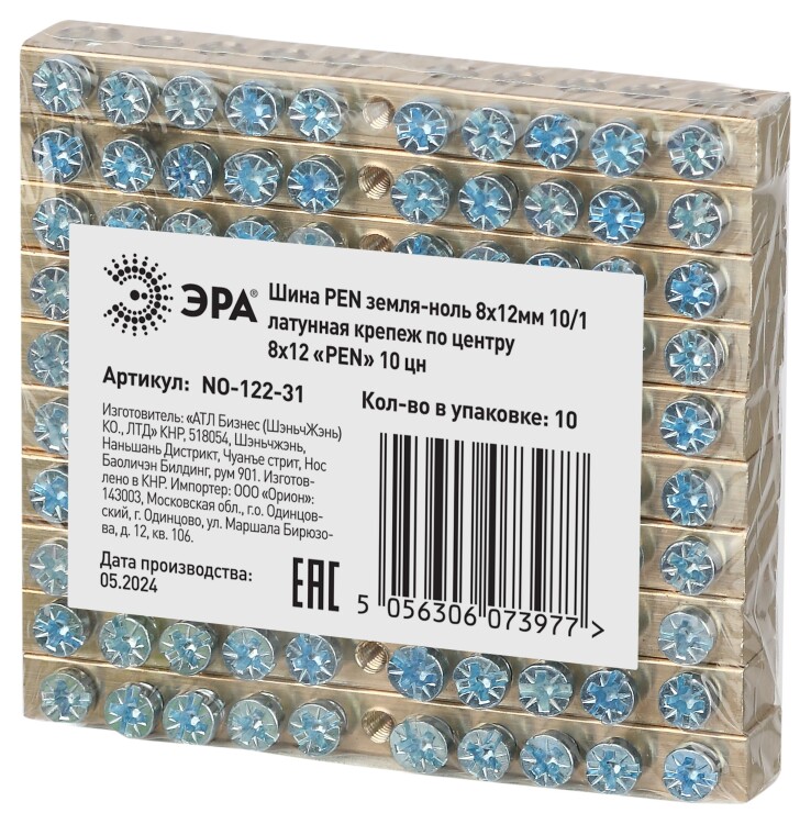 Шина ЭРА NO-122-31 PEN земля-ноль 8х12мм 10/1 латунная крепеж по центру