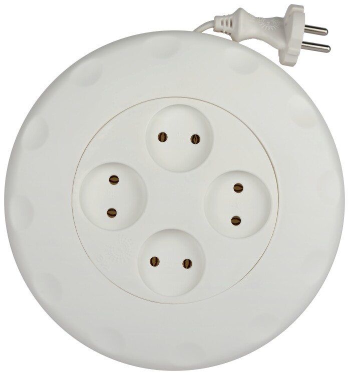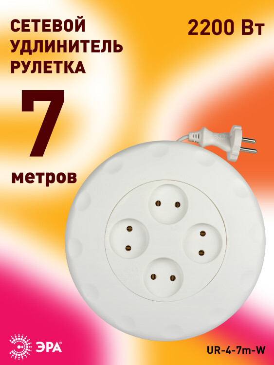 Удлинитель, 4 розетки, длина 7 м, 10А, ПВС 2х0.75 мм?, б/з, IP20, полипропилен, белый, рулетка, UR-4-7m-W