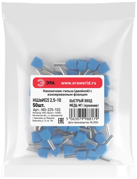 Наконечник-гильза ЭРА NO-225-103 (двойной) НШвИ(2) 2,5-10 с изолированным фланцем (упаковка 50 шт.)