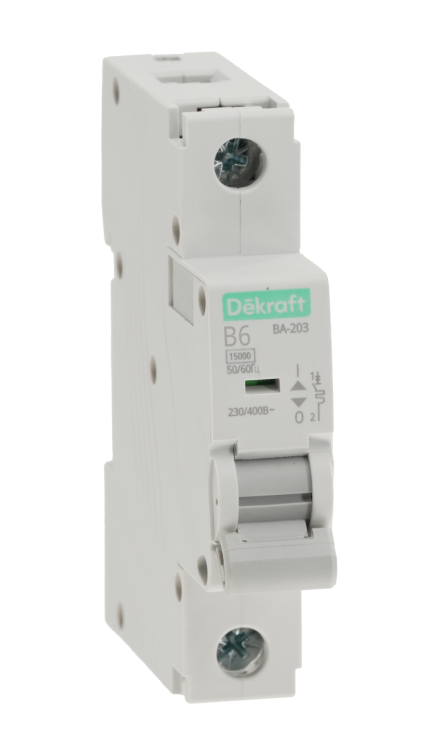 Автоматический выключатель серии ВА-203 Dekraft; 1P; ном. ток 6А; характеристика B; откл. способность 15 кА; ширина модуля 18мм. Аппараты имеют механизм мгновенной коммутации, 8 монолитных заклепок, которые повышают прочность корпуса. Боковые каналы охлаждения повышают стабильность работы при высоких температурах окружающей среды. Есть возможность установки дополнительных аксессуаров с обеих сторон устройства. Возможность соединения шиной FORK. Аппарат на 100% совместим с корпусами и оболочками Dekraft и Systeme Electric.