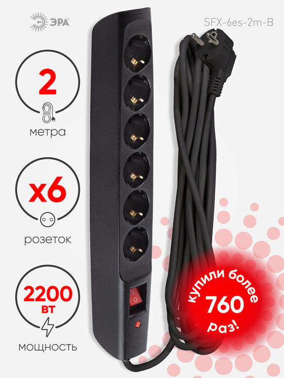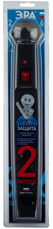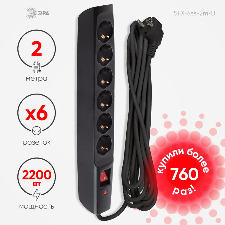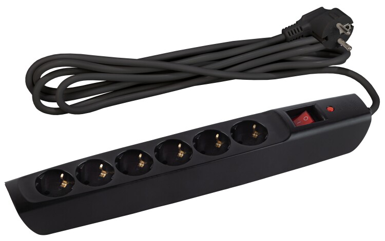 Сетевой фильтр, 6 розеток, длина 2 м, 3х0,75 мм², 10А, с/з, IP20, термопласт, чёрный, с выключателе