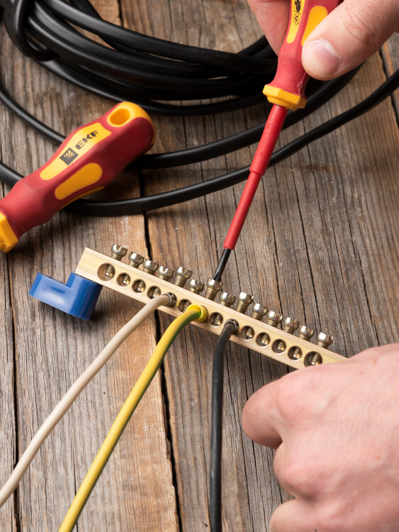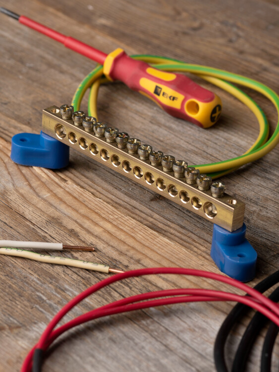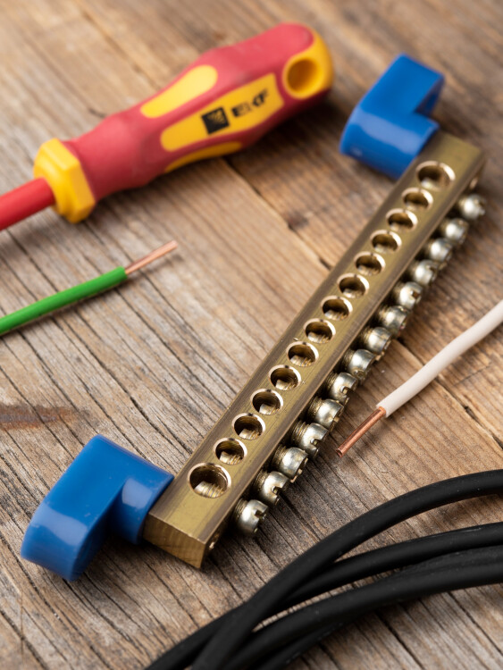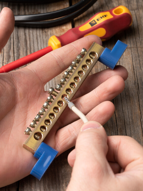 Шина "0" N (8х12мм) 14 отверстий латунь 2 синих угловых изолятора EKF PROxima