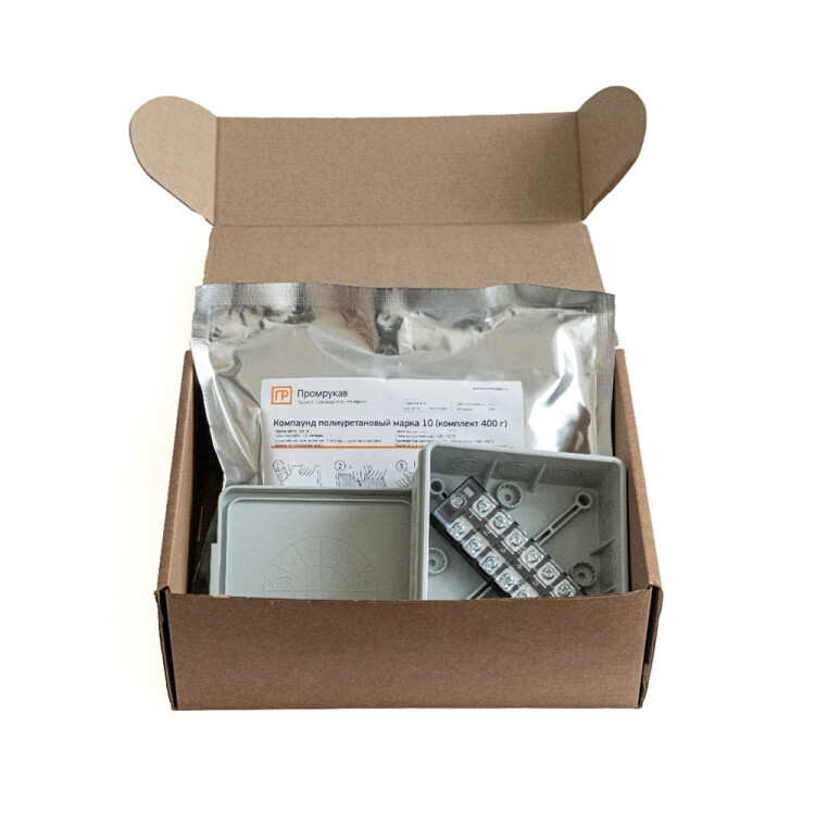 Коробка распределительная двухкомпонентная (HF) в комплекте с компаундом и с 6-кл. зажимами, сечение до 2,5 мм², 100х100х40 серая Промрукав