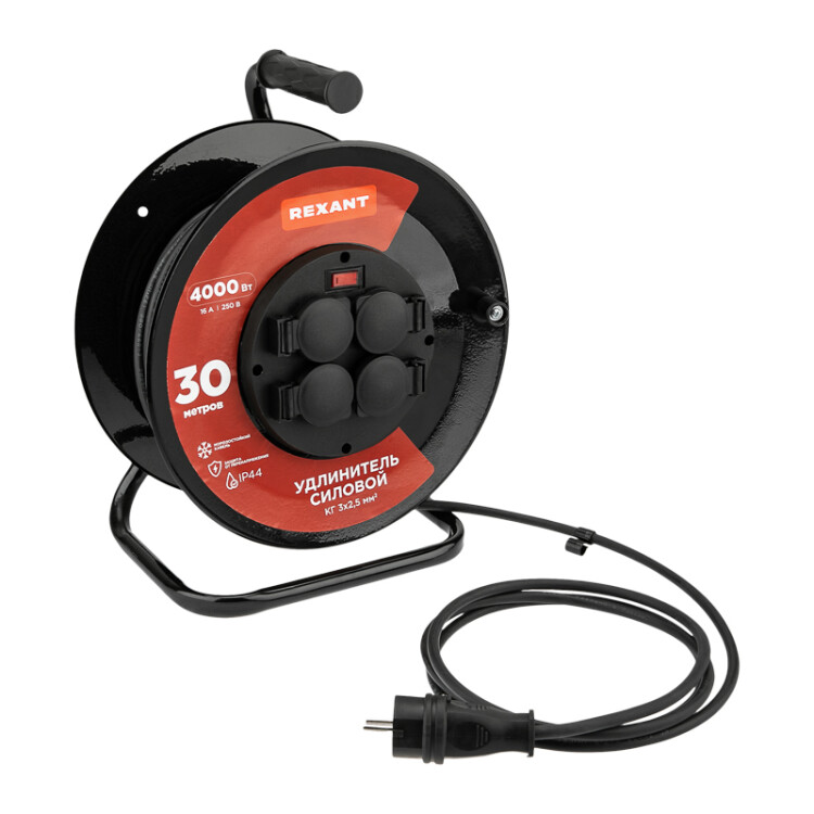 Удлинитель силовой КГ на катушке 4 гнезда, с/з, 30м, 3x2,5мм², IP44 с выключателем, c защитными крышками, металлическая катушка REXANT