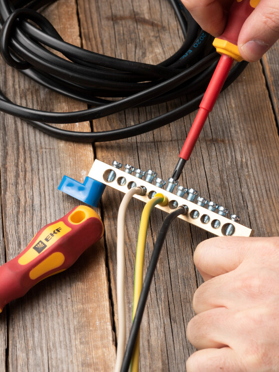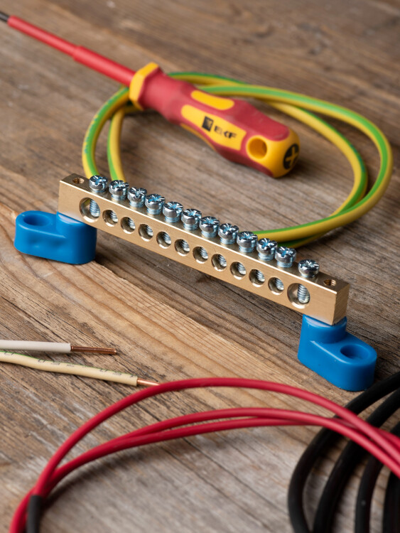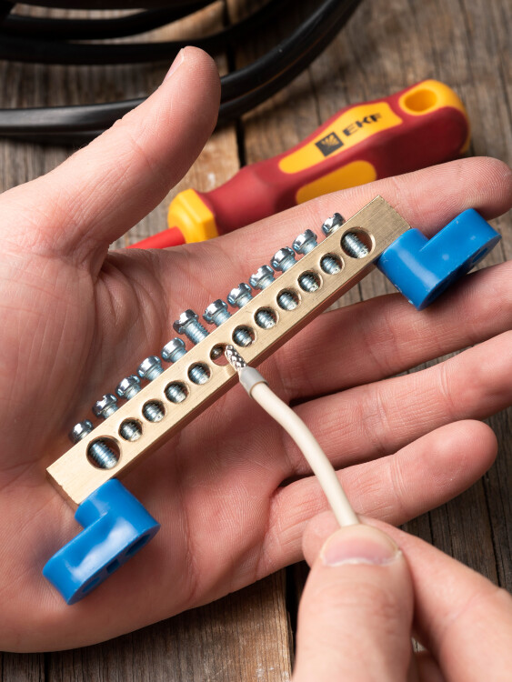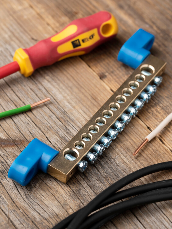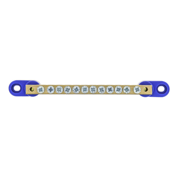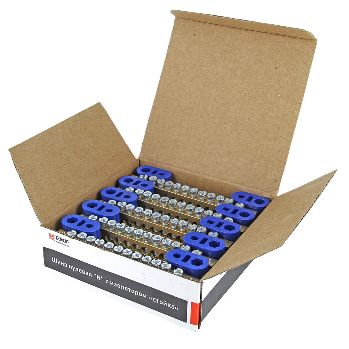 Шина "0" N (8х12мм) 12 отверстий латунь 2 синих угловых изолятора EKF PROxima