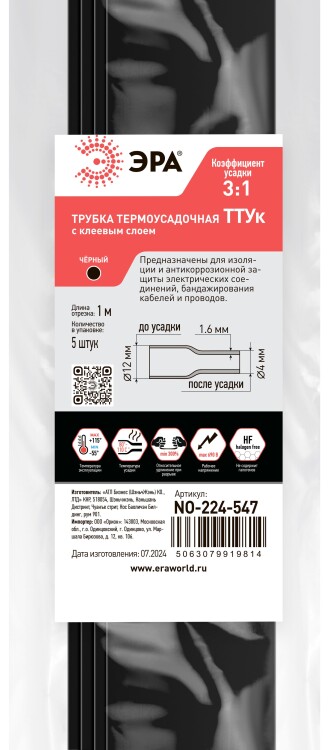 Термоусадочная трубка ЭРА NO-224-547 ТТУк 12/4 чёрная с клеевым слоем в отрезках по 1 м 5 шт