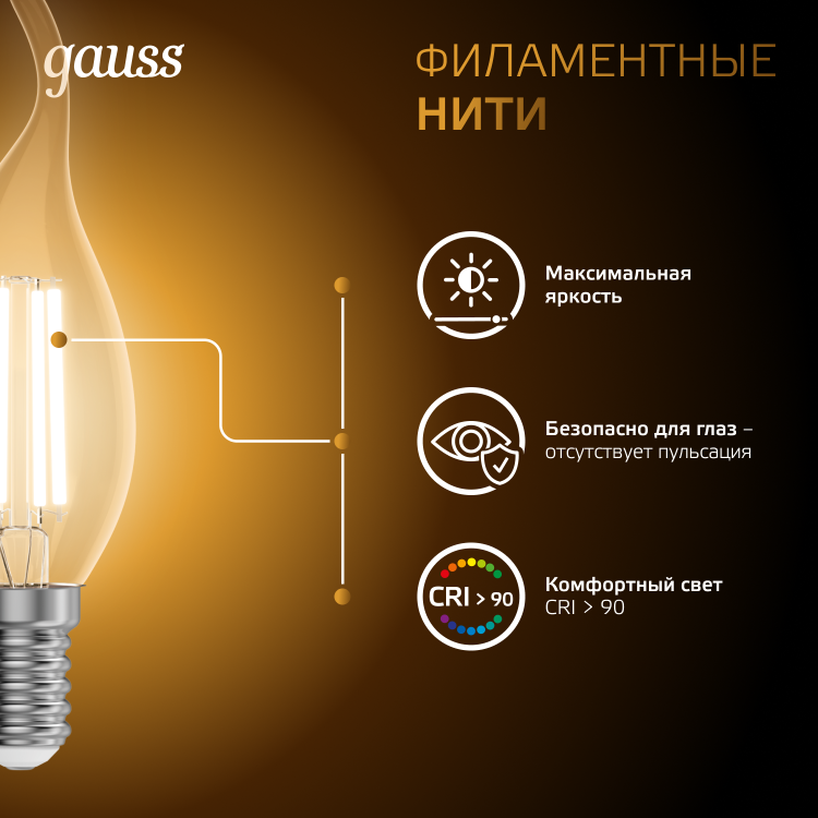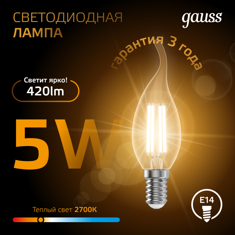 Лампа светодиодная 5 Вт 230В Е14 Filament свеча на ветру, тёплый 2700К