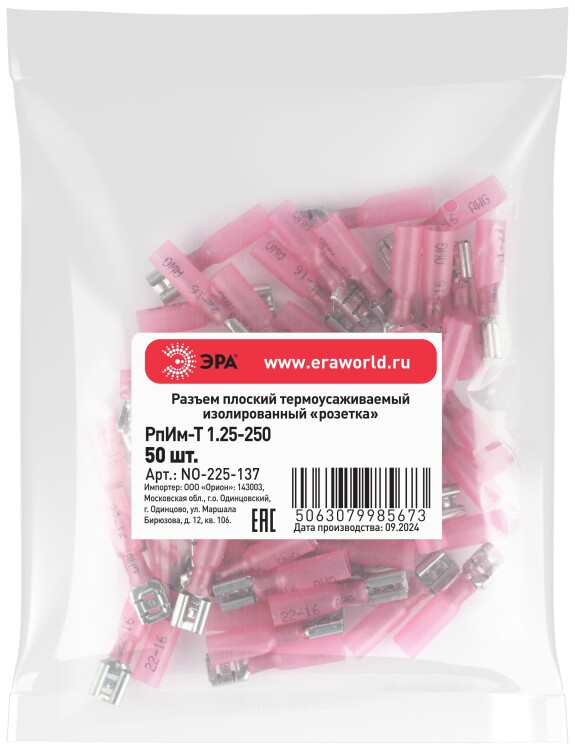 Разъем плоский термоусаживаемый ЭРА NO-225-137 РпИм-Т 1.25-250 изолированный «розетка» (упак. 50 шт.)