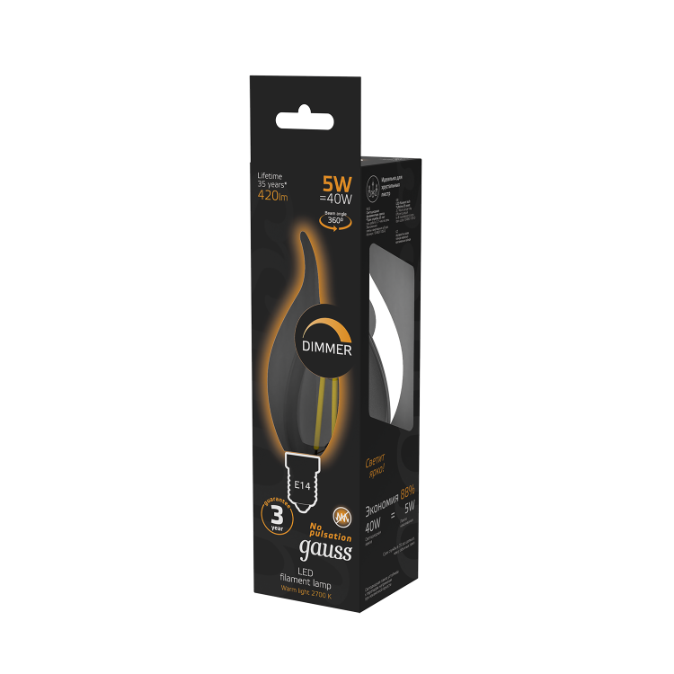 Лампа светодиодная 5 Вт 230В Е14 Filament свеча на ветру диммируемая, тёплый 2700К