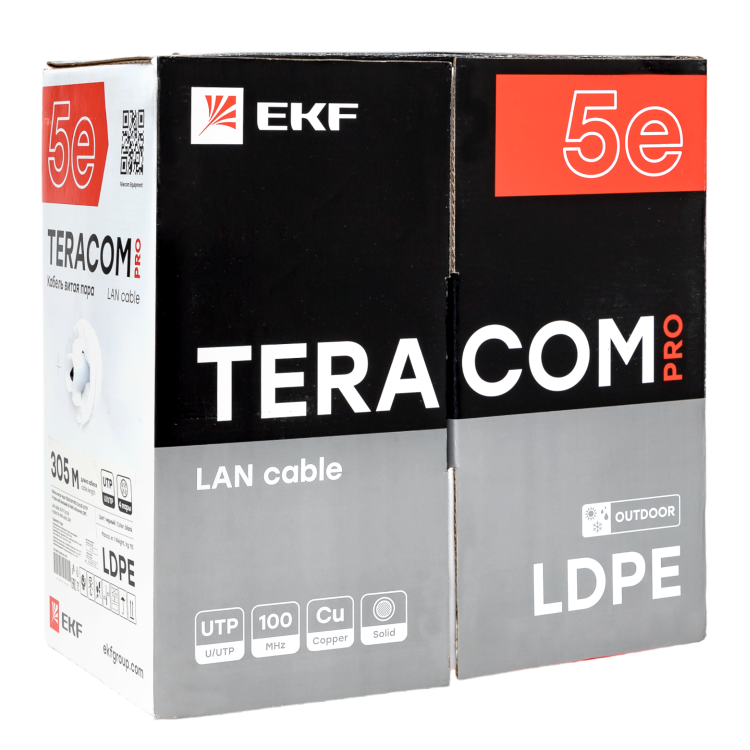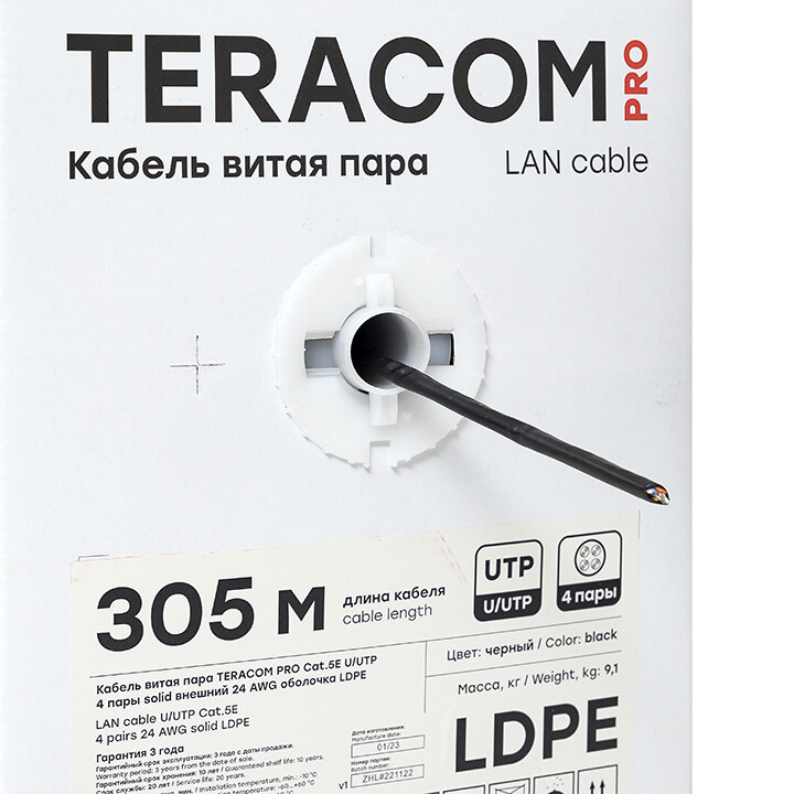 Кабель витая пара TERACOM PRO Cat.5E U/UTP 4 пары solid внешний 24AWG оболочка LDPE цвет черный (упак. 305м)