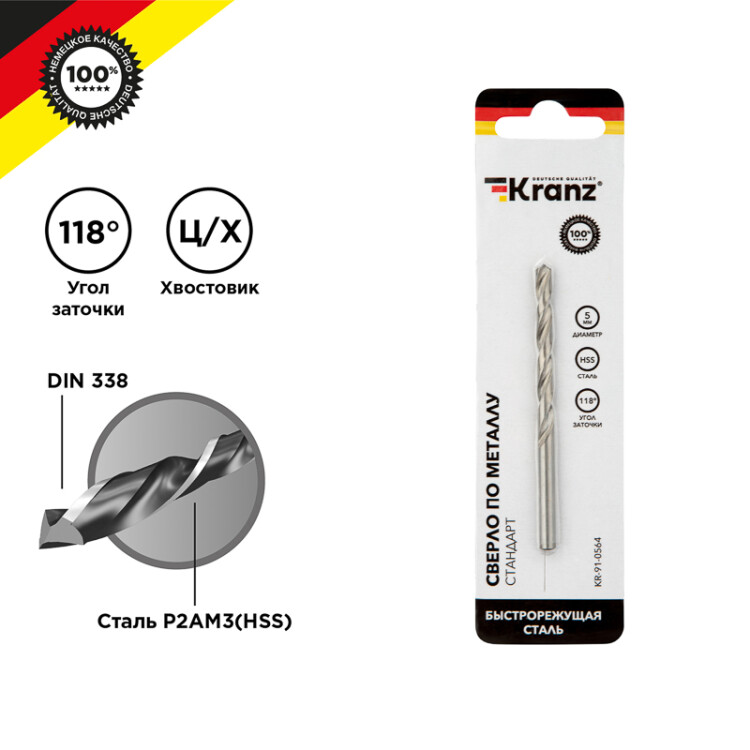 Сверло по металлу, 5х52х86 мм, (1 шт. в уп.), HSS, Стандарт