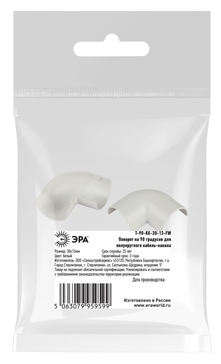 Поворот ЭРА T-90-KK-30-13-FW на 90 градусов для полукруглого кабель-канала белый 30х13мм 2шт/комплект