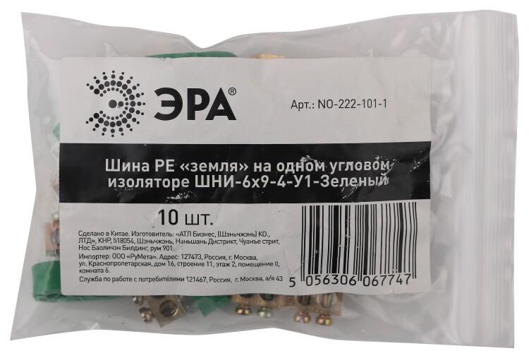 Шина ЭРА NO-222-101-1 PE земля на одном угловом изоляторе ШНИ-6х9-4-У1-Зеленый